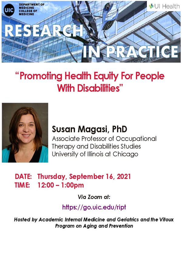 Dr. Susan Magasi, PhD is presenting for the Division of Academic Internal Medicine & Geriatrics (AIM) and the Vitoux Program on Aging & Prevention, Department of Medicine’s “Research in Practice” seminar talks.