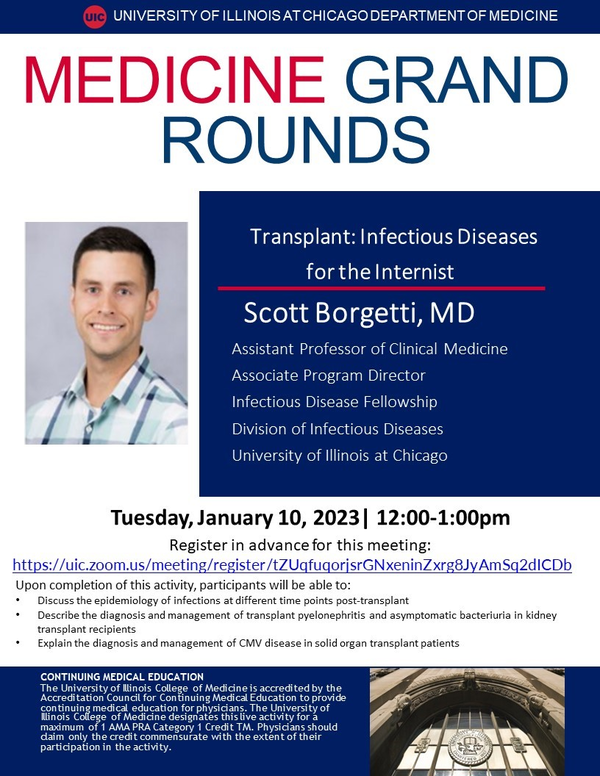 Please join the Department of Medicine for Grand Rounds lecture: Transplant: Infectious Diseases for the Internist with Dr. Scott Borgetti | January 10,2022| noon to 1PM