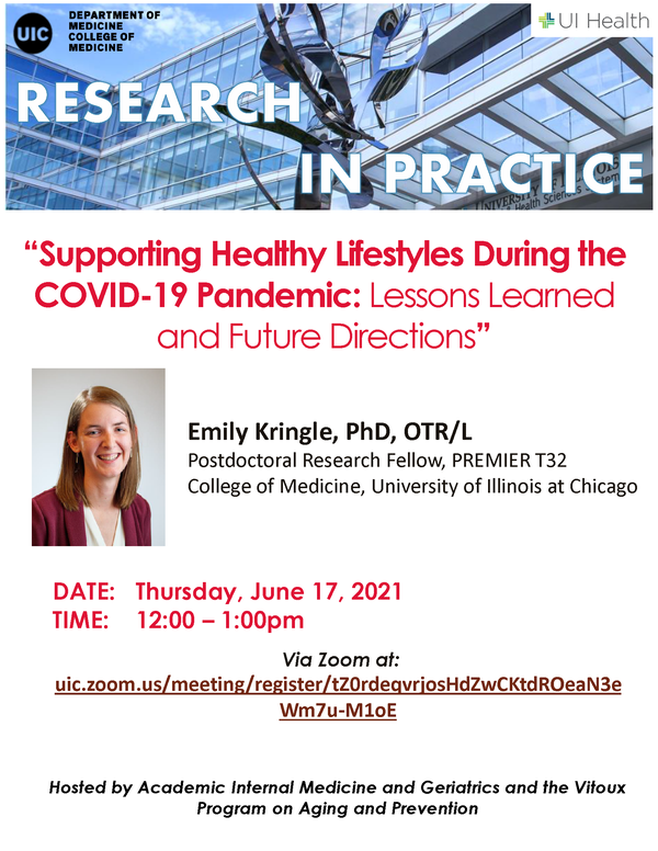 Dr. Emily Kringle is presenting for the Division of Academic Internal Medicine & Geriatrics (AIM) and the Vitoux Program on Aging & Prevention, Department of Medicine’s “Research in Practice” seminar talks: