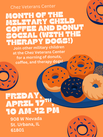 Join other military children for a Month of the Military Child coffee and donuts social (with the therapy dogs)! Get to know other military dependents in your community, build connections, and learn about the resources that the Chez Veterans Center provides you as a child of a service member. Take a break, join us for coffee, donuts, community, and petting therapy dogs!