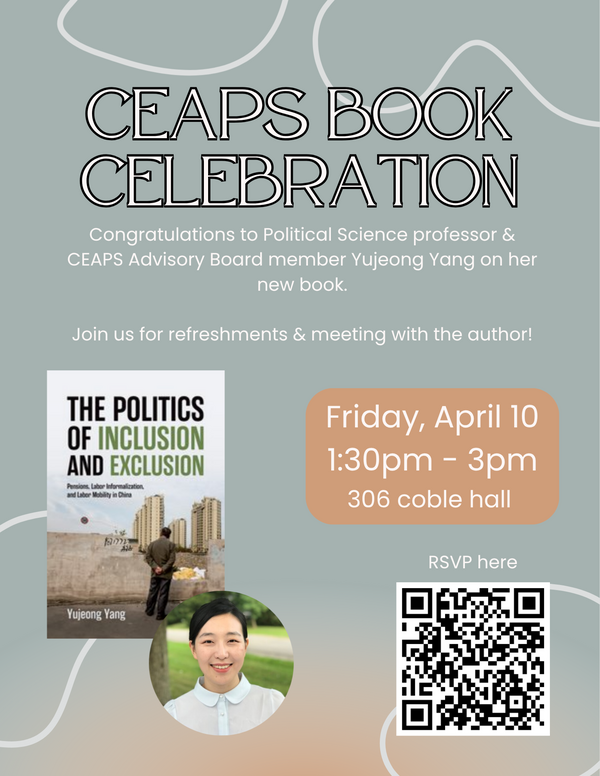 Join us to help celebrate Political Science professor & CEAPS Advisory Board member Yujeong Yang on her new book! Refreshments will be served. Please register at the link above.