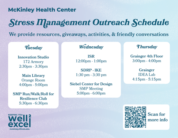 Weekly interactive tabling events to learn about resources for stress management individually and throughout the campus community. Each week we have education, an activity, and giveaways around a new theme. Please join us for a break in your day!