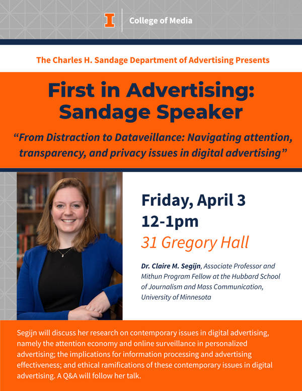 12:00 - 1:00 pm 4/3/202631 Gregory HallDr. Claire M. Segijn, associate professor at the Hubbard School of Journalism and Mass Communication, University of Minnesota–Twin Cities, and Mithun Program Fellow in Advertising, will present at the First in Advertising: Sandage Speaker Series.