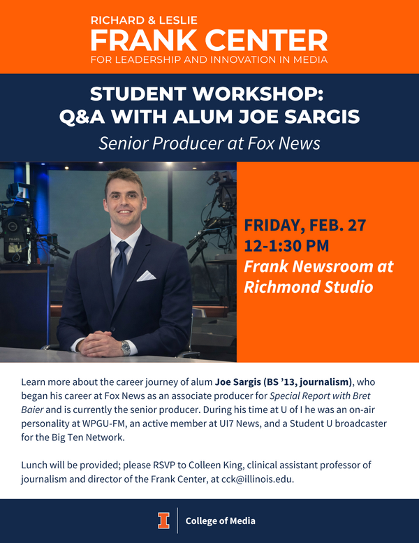 12:00 - 1:30 pm 2/27/2026Frank Newsroom at Richmond Studio, 1110 W. Main, UrbanaLearn more about the career journey of Joe Sargis (BS ’13, journalism) and his time at Fox News as a senior producer. During his time at U of I he was an on-air personality at WPGU-FM, an active member at UI7 News, and a Student U broadcaster for the Big Ten Network. Sargis worked at WCIU-TV in Chicago as a production assistant, associate producer, and then line producer.