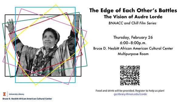 6:00 - 8:00 pm 2/26/2026Bruce D. Nesbitt African American Cultural Center Multipurpose Room, 1212 W. Nevada Street, Urbana, ILJoin us for a film screening of The Edge of Each Other’s Battles (2002), a 59-minute documentary honoring Audre Lorde, followed by a facilitated discussion.