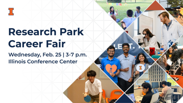 3:00 - 7:00 pm 2/25/2026Illinois Conference Center (Heritage Hall), 1900 S. First St., Champaign, ILThe Research Park Career Fair is an opportunity for University of Illinois students to connect with Research Park employers and learn about on-campus internships and full-time job opportunities.