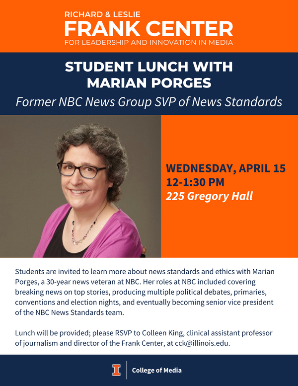 12:00 - 1:30 pm 4/15/2026225 Gregory HallStudents are invited to learn more about news standards and ethics with Marian Porges, a 30-year news veteran at NBC. Her roles at NBC included covering breaking news on top stories, producing multiple political debates, primaries, conventions and election nights, and eventually becoming senior vice president of the NBC News Standards team.